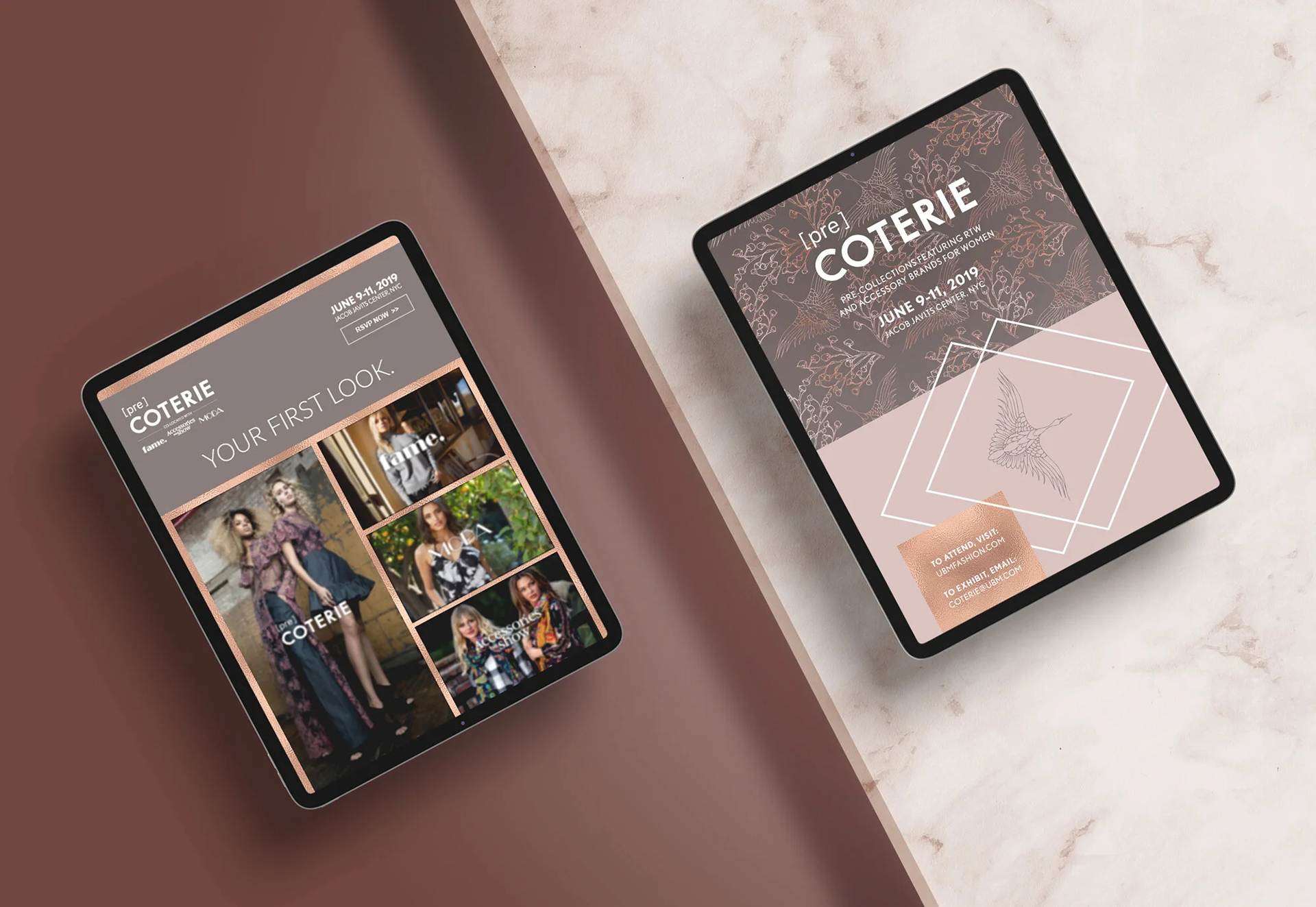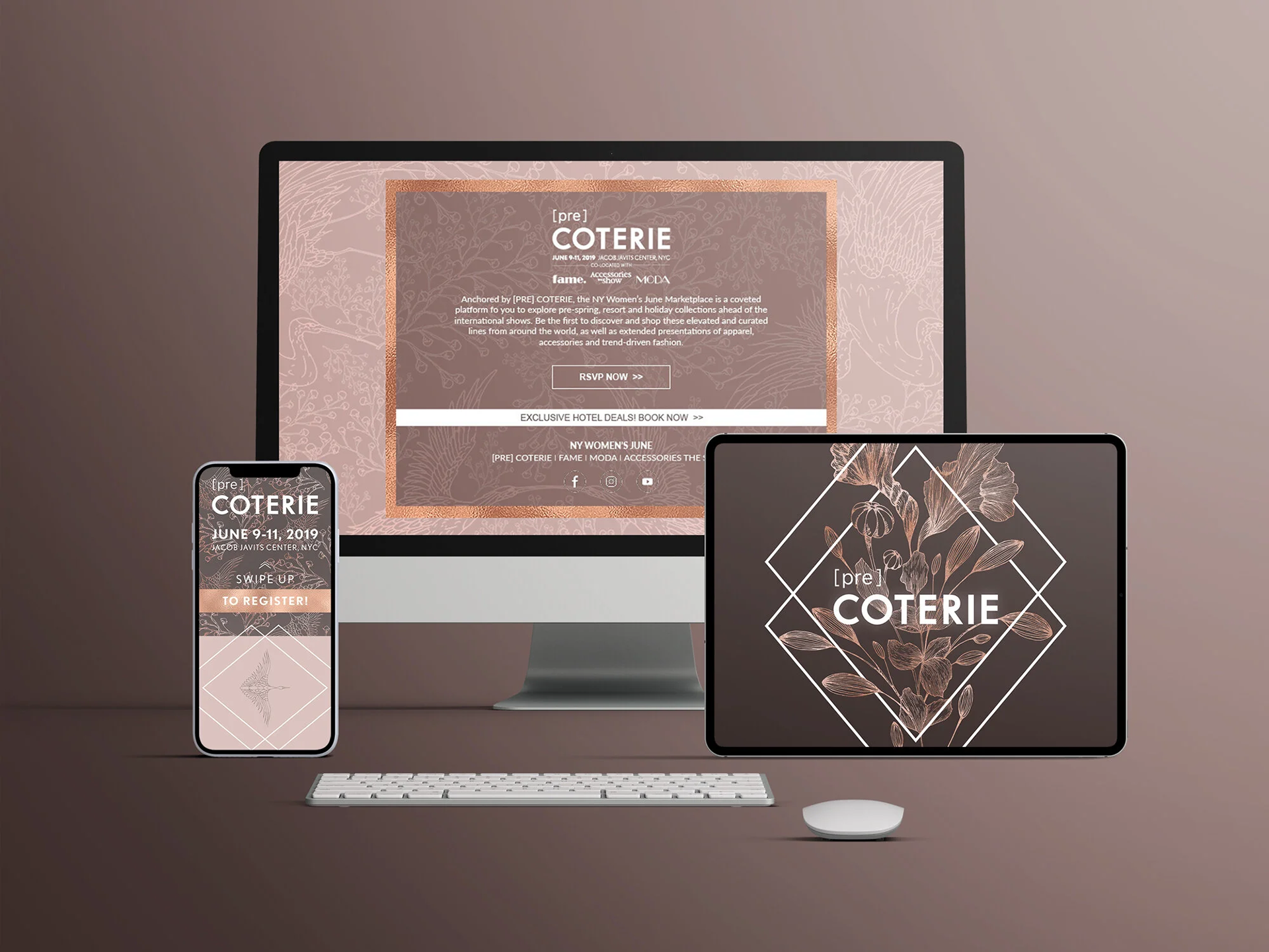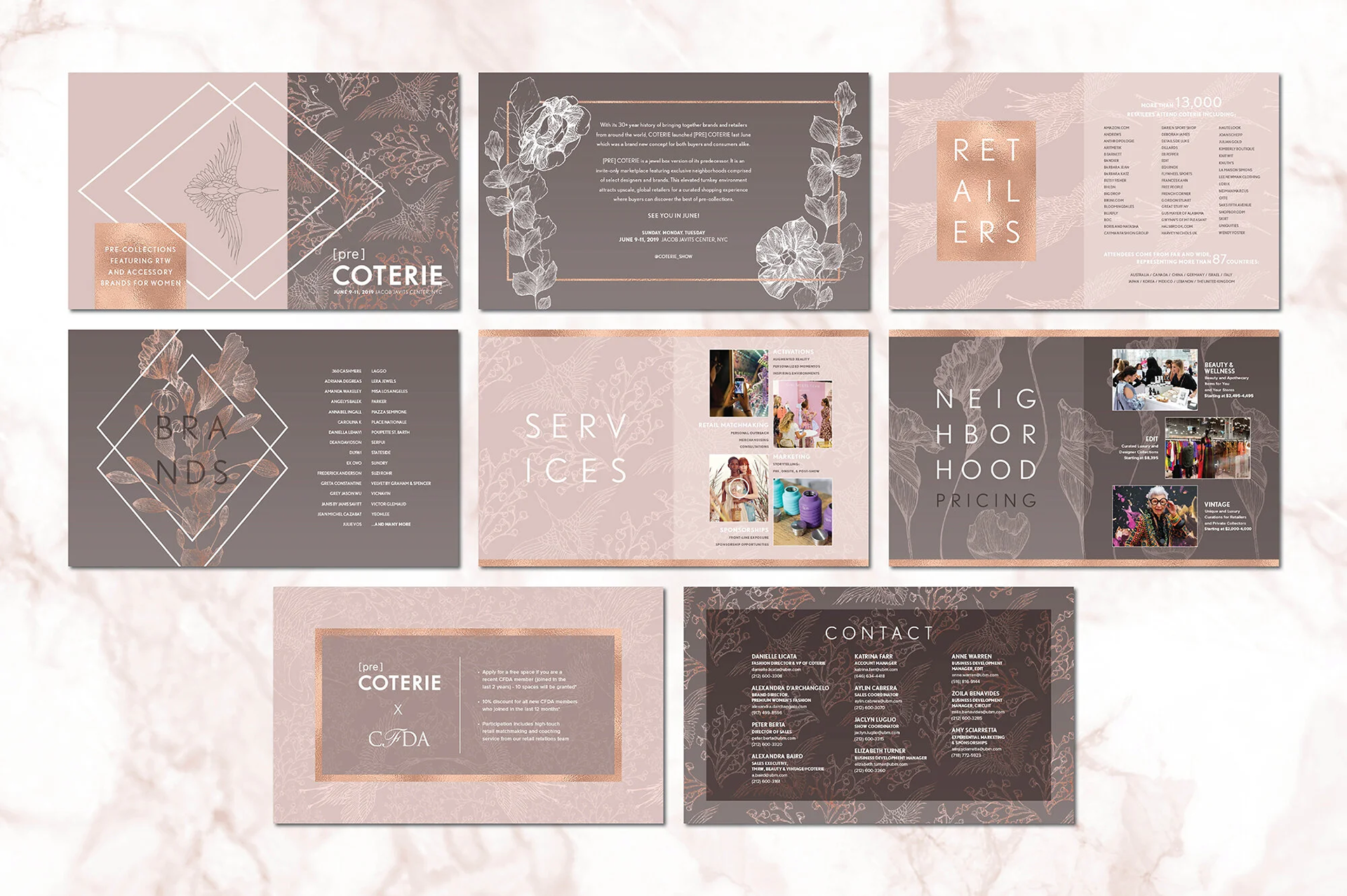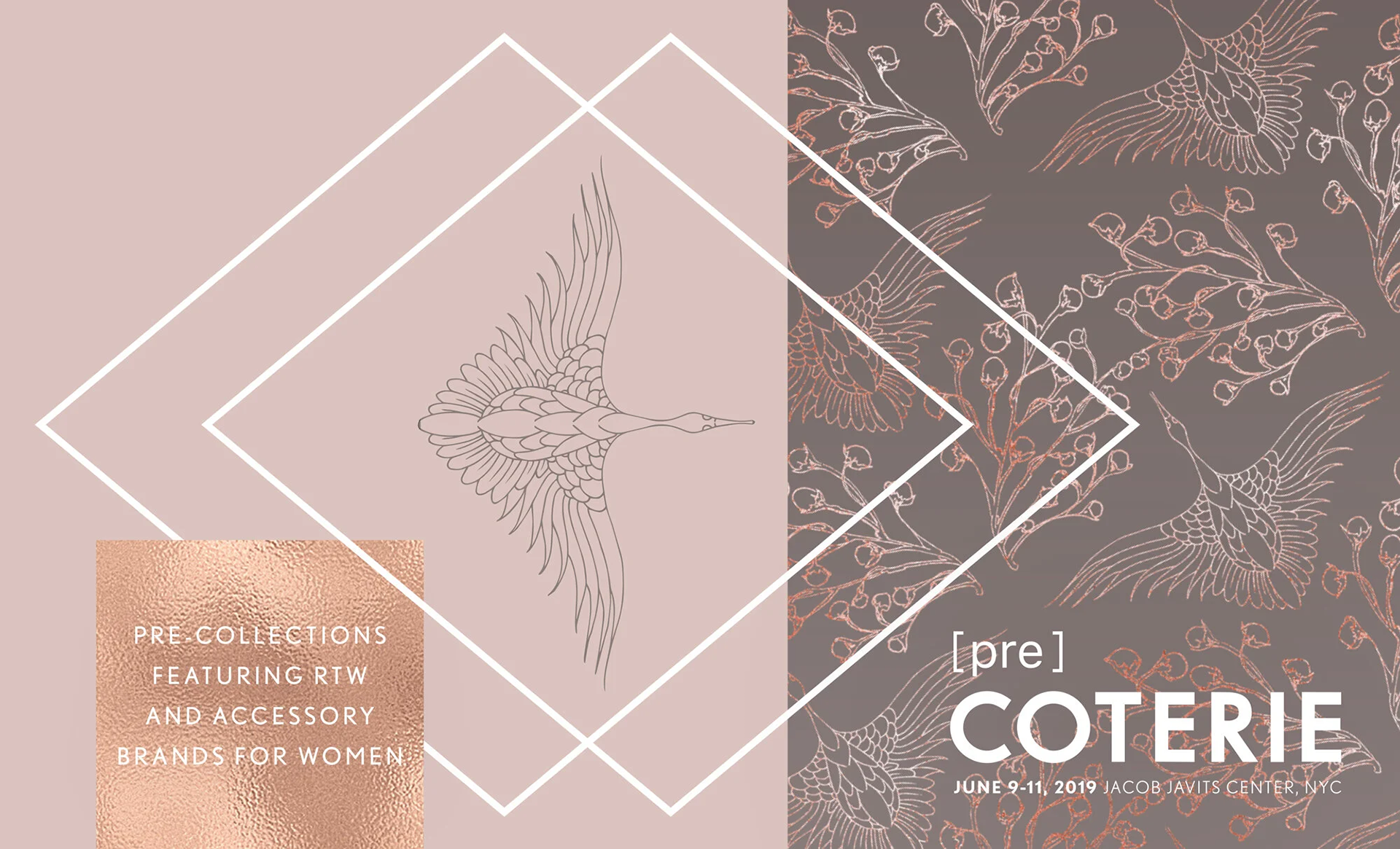Concepted and designed the June 2019 Campaign for [pre]COTERIE, a pre-collections fashion trade event for the global fashion elite. This elevated turnkey environment attracted upscale, global retailers for a curated shopping experience and was held in New York at the Javits Center.